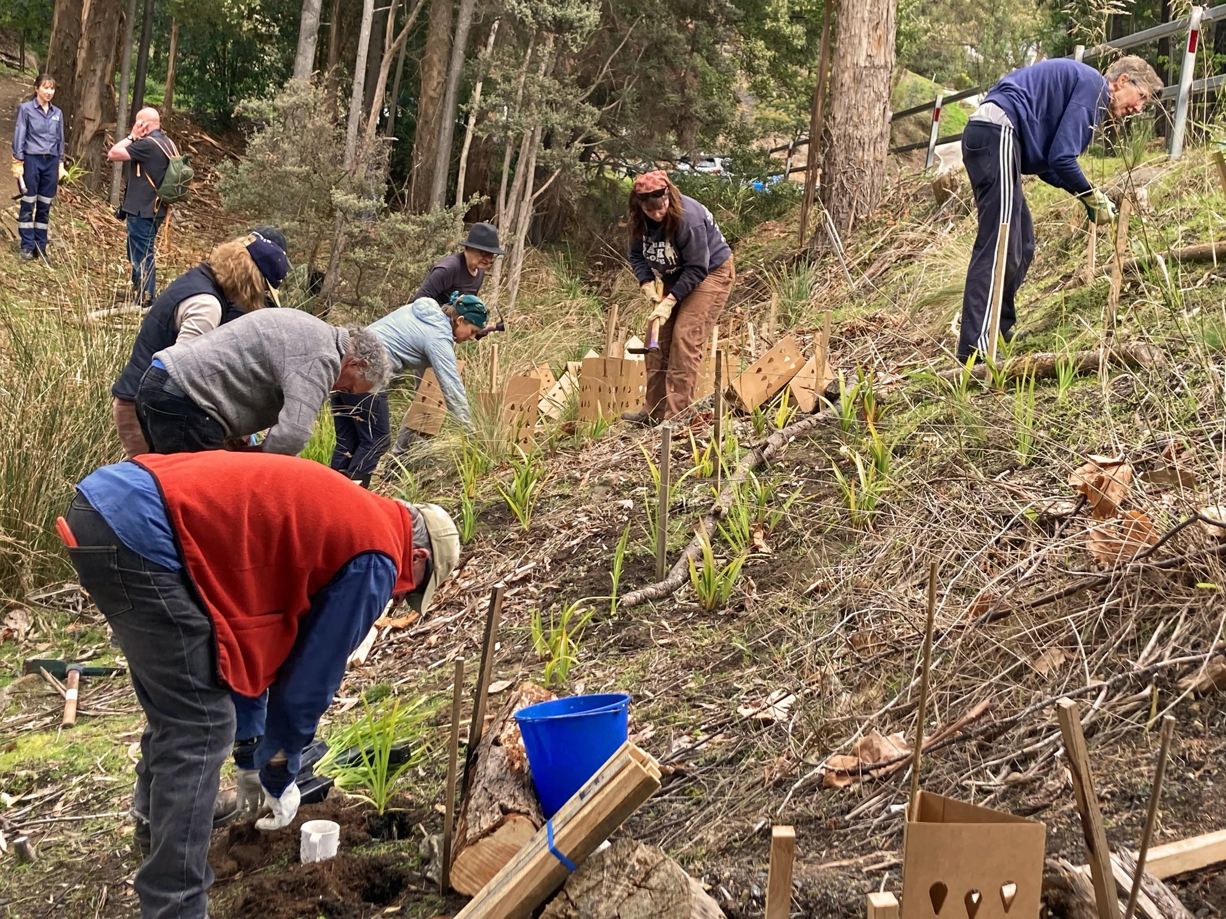 Planting native grasses to stabilise the creek bank in Salvator Rosa Glen